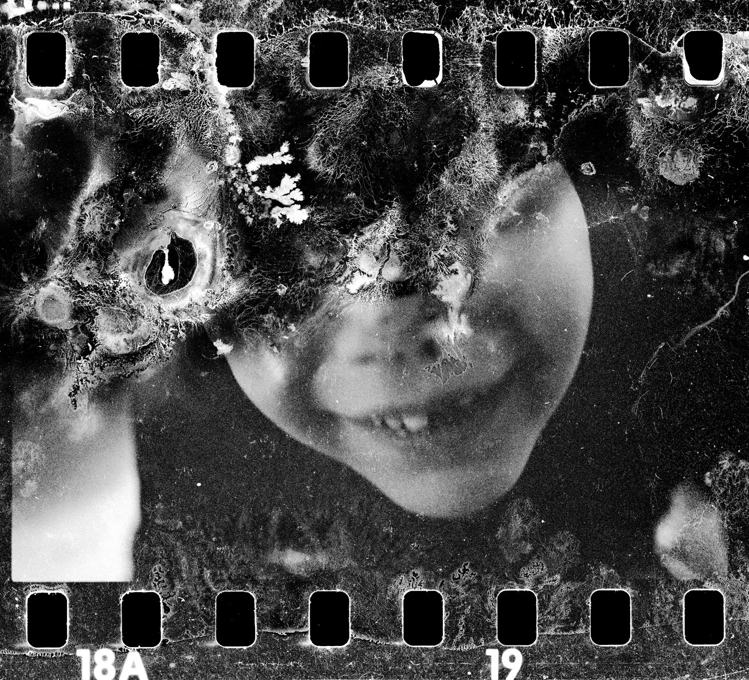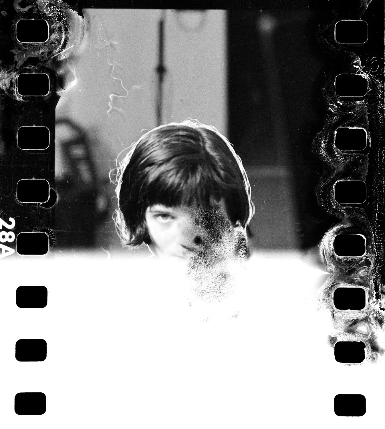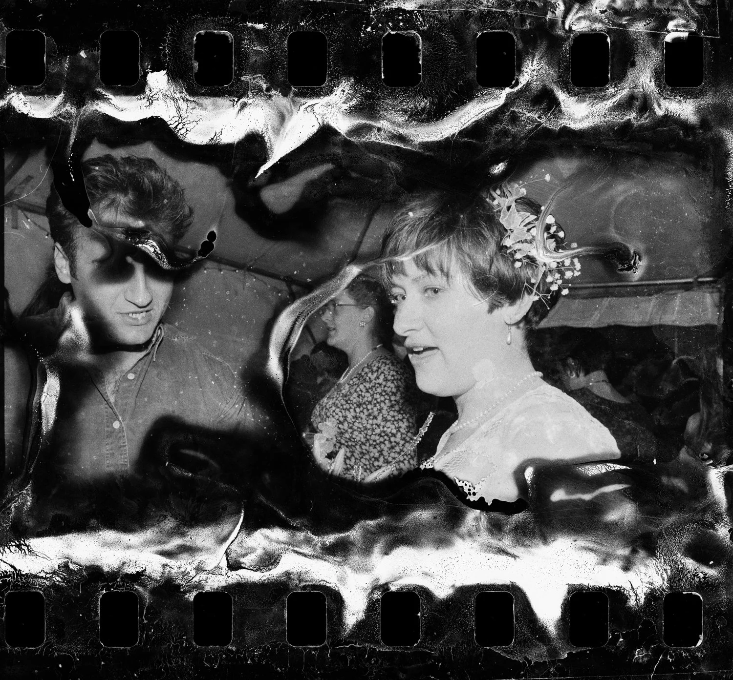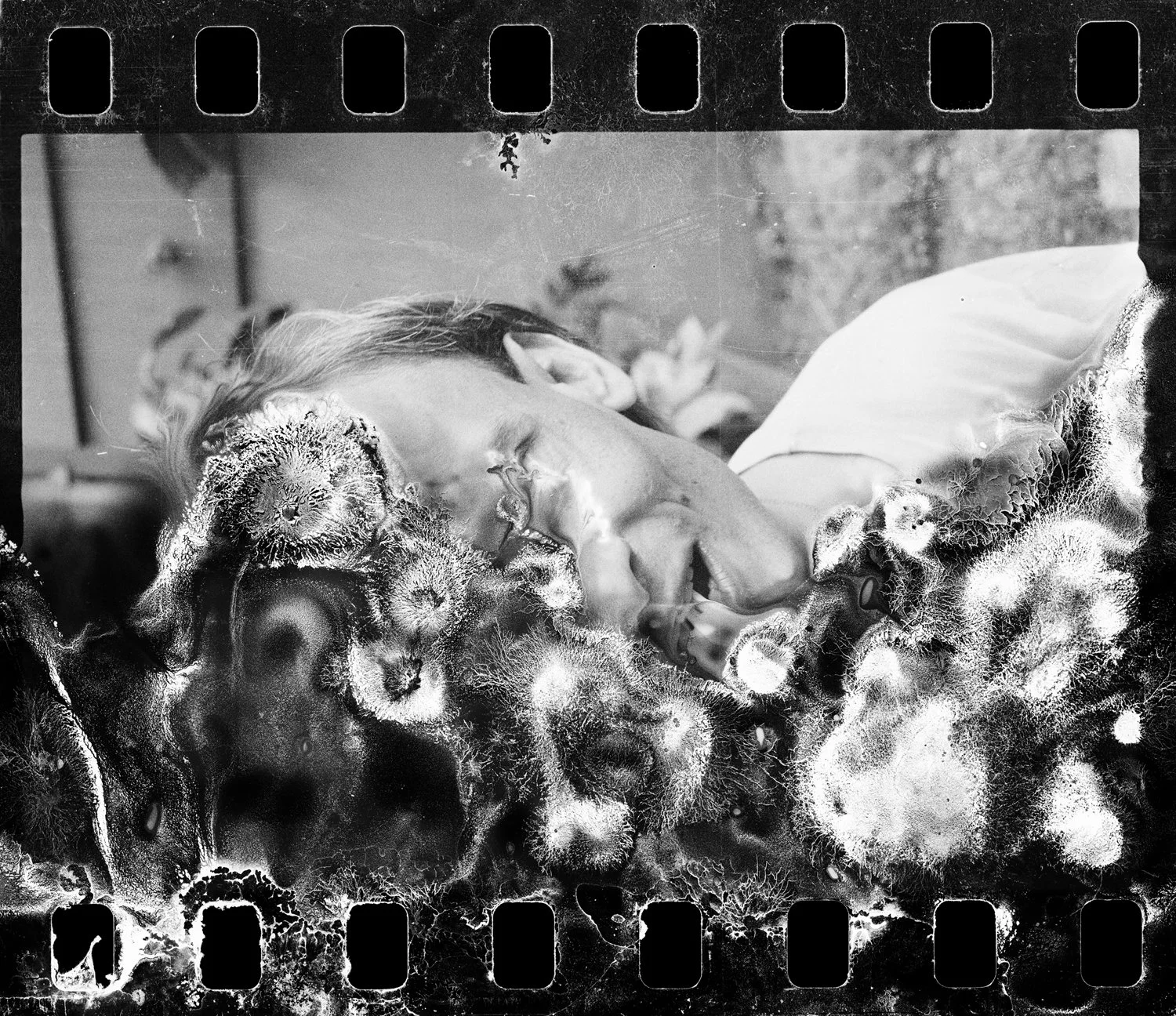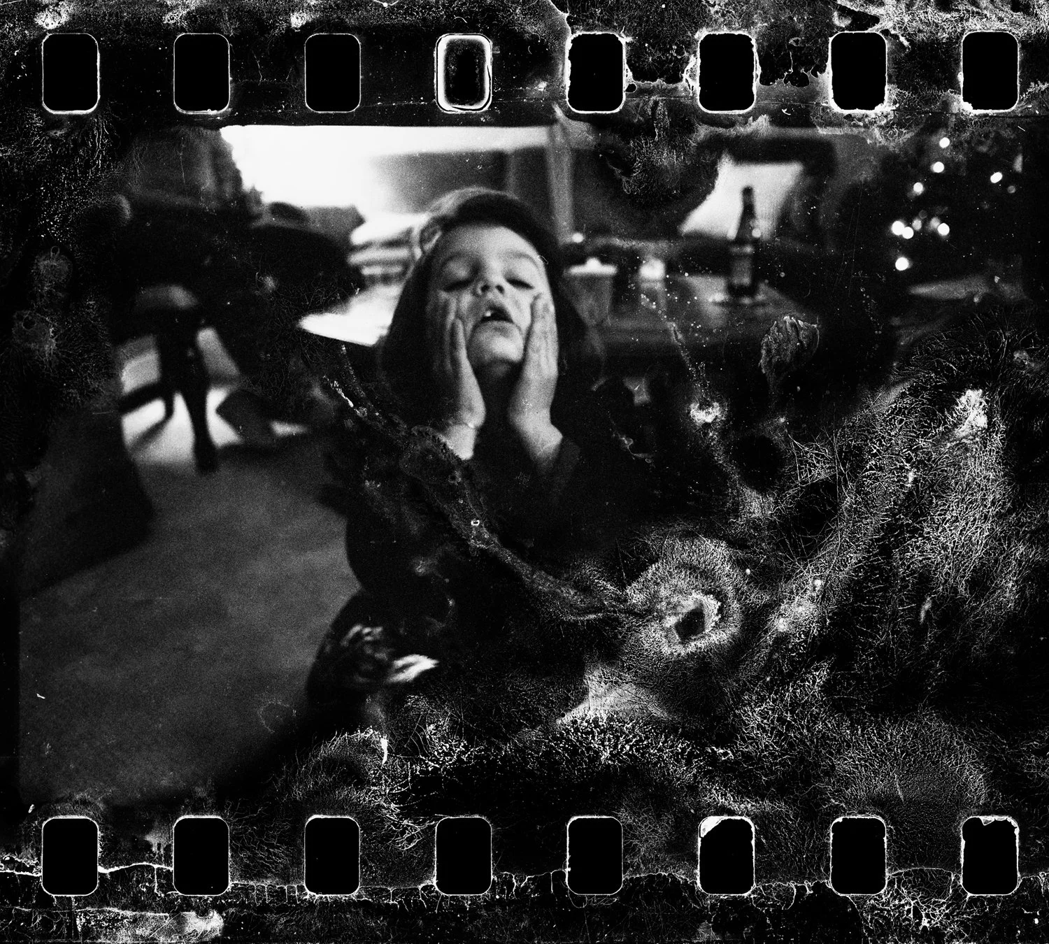 I began to review them on a light box with a loupe and with a film scanner app on my phone. I began piecing together the images that struck an emotional chord with me. Water on the emulsion had transformed the composition of the negatives, making them something entirely new and different. They had shape-shifted into something else. Our experience of remembering the past can change each time it is revisited; it is elastic. I realized that this was emblematic of what time does to all of us, to our memories, to our lives. There’s a certain beauty to the starkly different, damaged images, just as there is a certain beauty to the ravages of time.